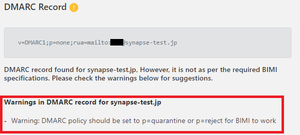 ここでは自社テスト用ドメインに「p=none」を設定してどのようなメッセージが出るか見てみます。