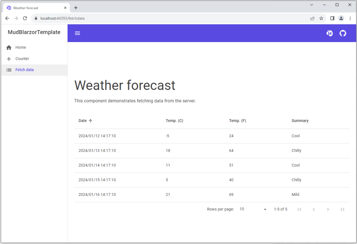 @page "/fetchdata" @using MudBlarzorTemplate.Data @inject WeatherForecastService ForecastService <PageTitle>Weather forecast</PageTitle> <MudText Typo="Typo.h3" GutterBottom="true">Weather forecast</MudText> <MudText Class="mb-8">This component demonstrates fetching data from the server.</MudText> @if (forecasts == null) { <MudProgressCircular Color="Color.Default" Indeterminate="true" /> } else { <MudTable Items="forecasts" Hover="true" SortLabel="Sort By" Elevation="0"> <HeaderContent> <MudTh><MudTableSortLabel InitialDirection="SortDirection.Ascending" SortBy="new Func<WeatherForecast, object>(x=>x.Date)">Date</MudTableSortLabel></MudTh> <MudTh><MudTableSortLabel SortBy="new Func<WeatherForecast, object>(x=>x.TemperatureC)">Temp. (C)</MudTableSortLabel></MudTh> <MudTh><MudTableSortLabel SortBy="new Func<WeatherForecast, object>(x=>x.TemperatureF)">Temp. (F)</MudTableSortLabel></MudTh> <MudTh><MudTableSortLabel SortBy="new Func<WeatherForecast, object>(x=>x.Summary!)">Summary</MudTableSortLabel></MudTh> </HeaderContent> <RowTemplate> <MudTd DataLabel="Date">@context.Date</MudTd> <MudTd DataLabel="Temp. (C)">@context.TemperatureC</MudTd> <MudTd DataLabel="Temp. (F)">@context.TemperatureF</MudTd> <MudTd DataLabel="Summary">@context.Summary</MudTd> </RowTemplate> <PagerContent> <MudTablePager PageSizeOptions="new int[]{50, 100}" /> </PagerContent> </MudTable> } @code { private WeatherForecast[]? forecasts; protected override async Task OnInitializedAsync() { forecasts = await ForecastService.GetForecastAsync(DateTime.Now); } }